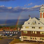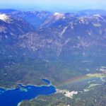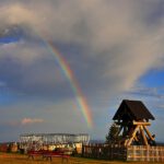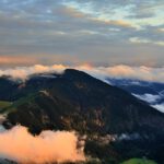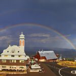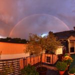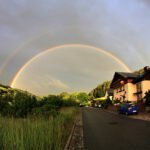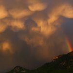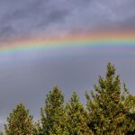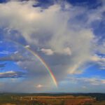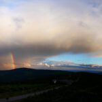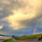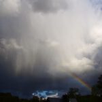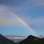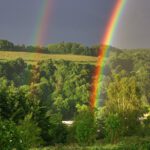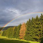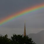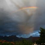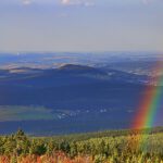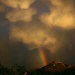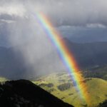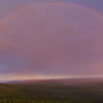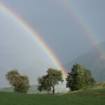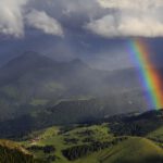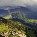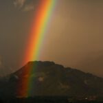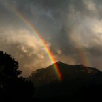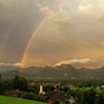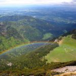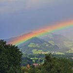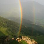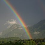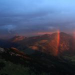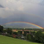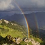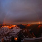 Anders ist es allerdings auf einem Berg. Denn dann fallen die Regentropfen auch unterhalb des Beobachters ins Tal. Bei horizontnaher Sonne setzt sich der Halbkreis nach unten hin fort. Steigt die Sonne jedoch über 40°, dann sinkt zwar auch hier der Regenbogenscheitel unter den Horizont, aber da sich auch dort Wassertröpfchen befinden, bleibt der Regenbogen sichtbar. Man sollte ihn bei dieser Sonnenhöhe also nicht mehr am Himmel suchen, sondern im Gegensonnenbereich im Tal.