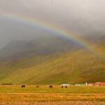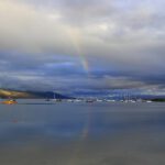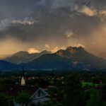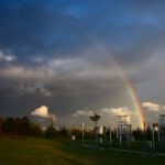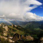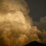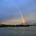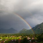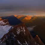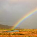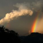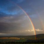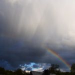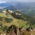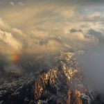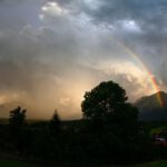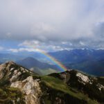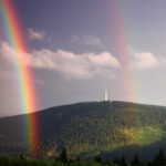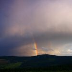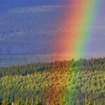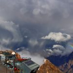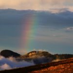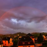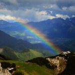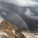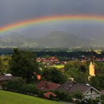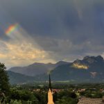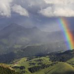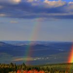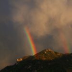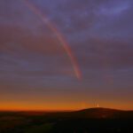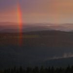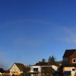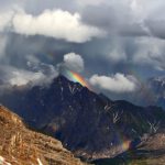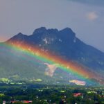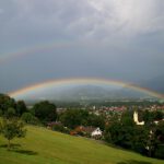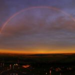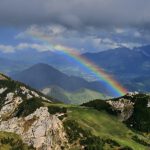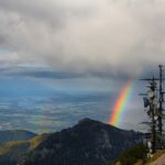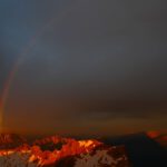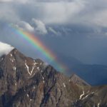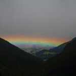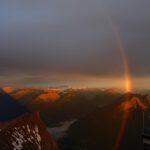 Anders ist es allerdings auf einem Berg. Denn dann fallen die Regentropfen auch unterhalb des Beobachters ins Tal. Bei horizontnaher Sonne setzt sich der Halbkreis nach unten hin fort. Steigt die Sonne jedoch über 40°, dann sinkt zwar auch hier der Regenbogenscheitel unter den Horizont, aber da sich auch dort Wassertröpfchen befinden, bleibt der Regenbogen sichtbar. Man sollte ihn bei dieser Sonnenhöhe also nicht mehr am Himmel suchen, sondern im Gegensonnenbereich im Tal.